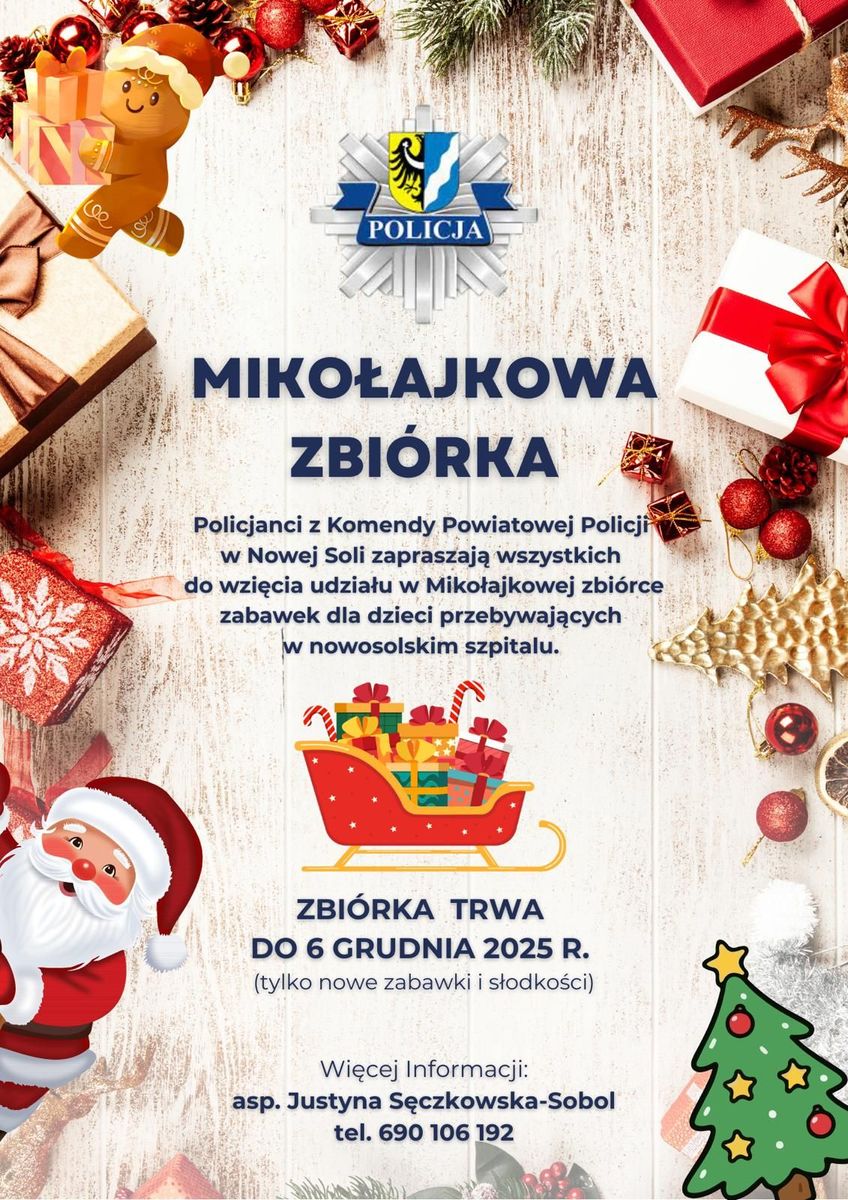 Lubuscy policjanci przez cały rok służą pomocą wszystkim obywatelom w zapewnianiu bezpieczeństwa. Włączają się również we wszelkie akcje pomocowe dla chorych dzieci i osób potrzebujących. Pomoc ta nasila się w okresie przedświątecznym, gdyż mundurowi chcą umilić im spędzanie tego magicznego czasu i tradycyjnie na Święta pomóc wszystkim, którzy tej pomocy potrzebują. Tym razem funkcjonariusze zorganizowali trzy zbiórki charytatywne, by w tym pięknym i magicznym okresie Świąt wcielić się w rolę Mikołaja. W przedsięwzięcie zaangażować się mogą wszyscy. Osoby, które chciałby pomóc proszone są o kontakt z rzecznikiem prasowym nowosolskiej jednostki- aspirant Justyną Sęczkowską-Sobol, tel.690106192. Rzeczy na zbiórkę można przynosić do komendy w godzinach 7.30-15.30 od poniedziałku do piątku i przekazać w/w osobie, lub w innym terminie można pozostawić w recepcji komendy.