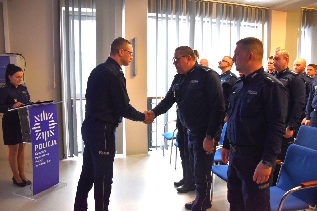 Spotkanie było okazją do omówienia najważniejszych wydarzeń, które miały miejsce już w 2025 roku. Na początku odprawy podsumowania pracy nowosolskich funkcjonariuszy dokonał Komendant Powiatowy Policji w Nowej Soli- nadkomisarz Mateusz Domaradzki, który przedstawił ocenę stanu bezpieczeństwa i porządku publicznego na terenie całego powiatu w zakresie pionu kryminalnego oraz dokonał oceny pracy pionu prewencji i ruchu drogowego. Nadkomisarz Domaradzki omówił, jakie są oczekiwania mieszkańców wobec Policji i w związku z tym, wskazał kierunki dalszej służby na rzecz poprawy bezpieczeństwa. Następnie głos zabrał I Zastępca Komendanta Wojewódzkiego Policji w Gorzowie Wielkopolskim inspektor Rafał Banach. W swoim przemówieniu docenił zaangażowanie policjantów powiatu nowosolskiego w zapewnienie bezpieczeństwa nie tylko na terenie powiatu, ale także w działania, z którymi przyszło się nam zmierzyć w 2025 roku. Na temat współpracy z Komendą Powiatową Policji w Nowej Soli wypowiedzieli się również zaproszeni goście, Starosta powiatu nowosolskiego- Pan Mariusz Stokłosa oraz Prokurator Rejonowy w Nowej Soli- Pan Patryk Wilk. Komendanci podziękowali policjantom oraz pracownikom cywilnym za trud i zaangażowanie w codzienną służbę. Słowa podziękowań skierowane zostały również do samorządowców oraz współpracujących służb mundurowych.